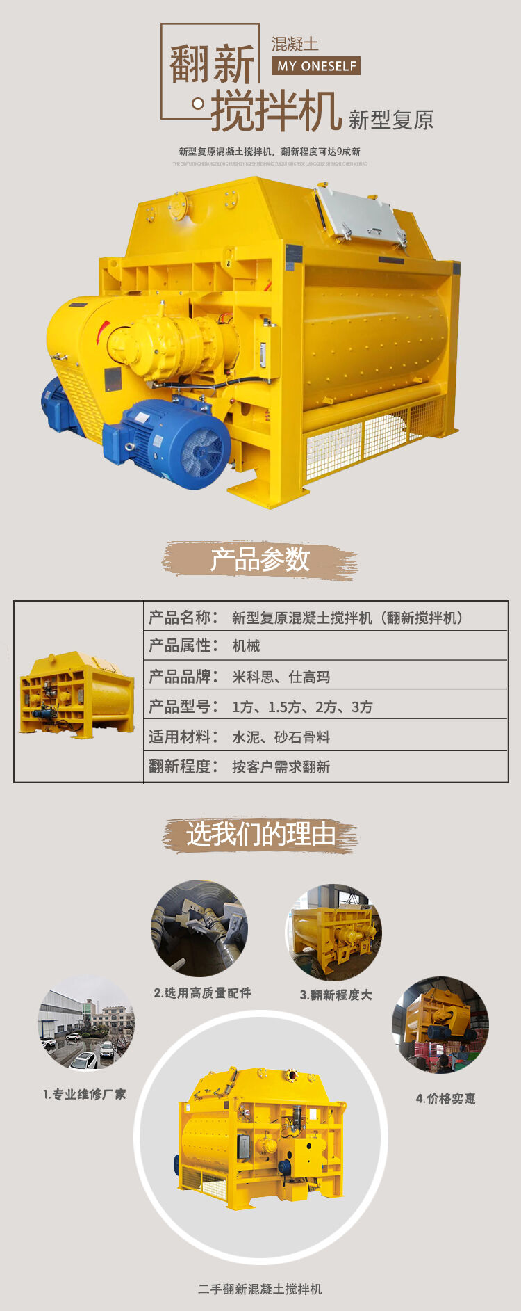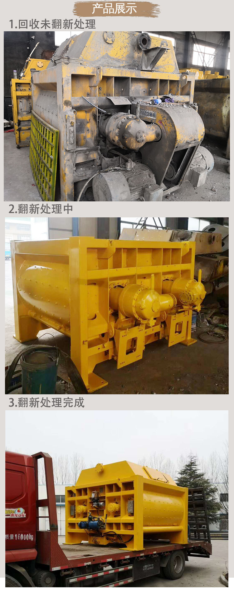 隨著國家基礎建設的大力推進,攪拌站轉場的速度也在加快,有些攪拌機使用2-3年就被閑置,未能發揮出他的最優性能。一些攪拌機的主要部件性能任然很好。為了將這一部分設備重新利用,我公司擁有專業的人員、評估、回收、檢修、然后再以嶄新的面貌服務客戶。