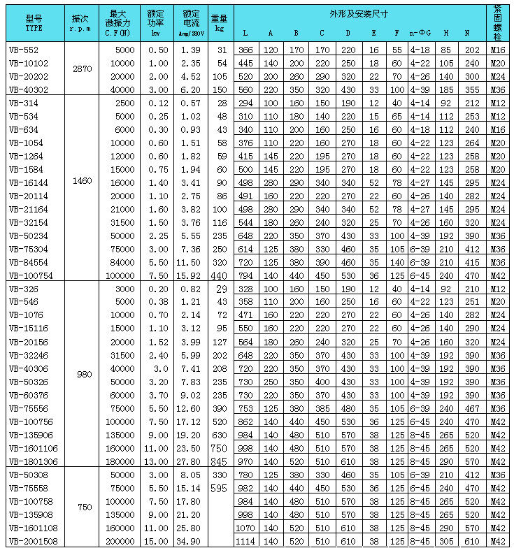 VB-1264-W振動電機外形安裝尺寸技術參數表