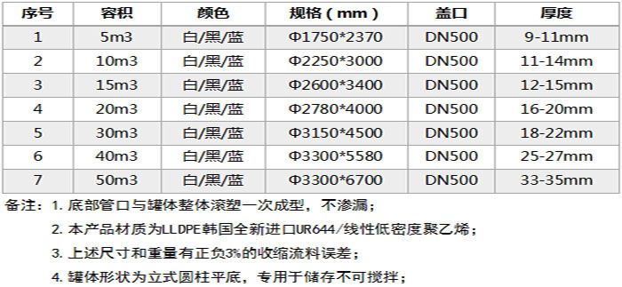 特點:所用材質為韓國進口聚乙烯(PE)滾塑原料,儲罐一次成型,內外光滑,具有良好的衛生性與抗紫外線能力,耐酸堿、耐腐蝕、易清洗、不易老化。它可以盛裝在常溫下無機酸、堿、鹽等大部分物質及有機物,耐熱耐凍 耐熱耐凍性佳,-5℃—+85℃均可使用