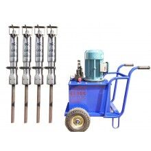 發潤牌劈裂機的速度是破碎錘的速度的7~8倍,大大縮短了工期。這個機器使用很簡單,一個工人就能完成全部操作,其結構就是一個高壓泵站加上輸油管連接的劈裂槍,使用的時候先在需要分裂的巖石上打一個50到100公分深的孔,然后插入劈裂槍,啟動機器,大約30到60秒,石塊即被裂開一條100公分左右長度,1.5公分寬度的裂縫。機器原理就是利用劈裂槍中間的楔塊伸縮,推動包圍楔塊的兩片劈塊往周圍張開,從而由內部脹開巖石。