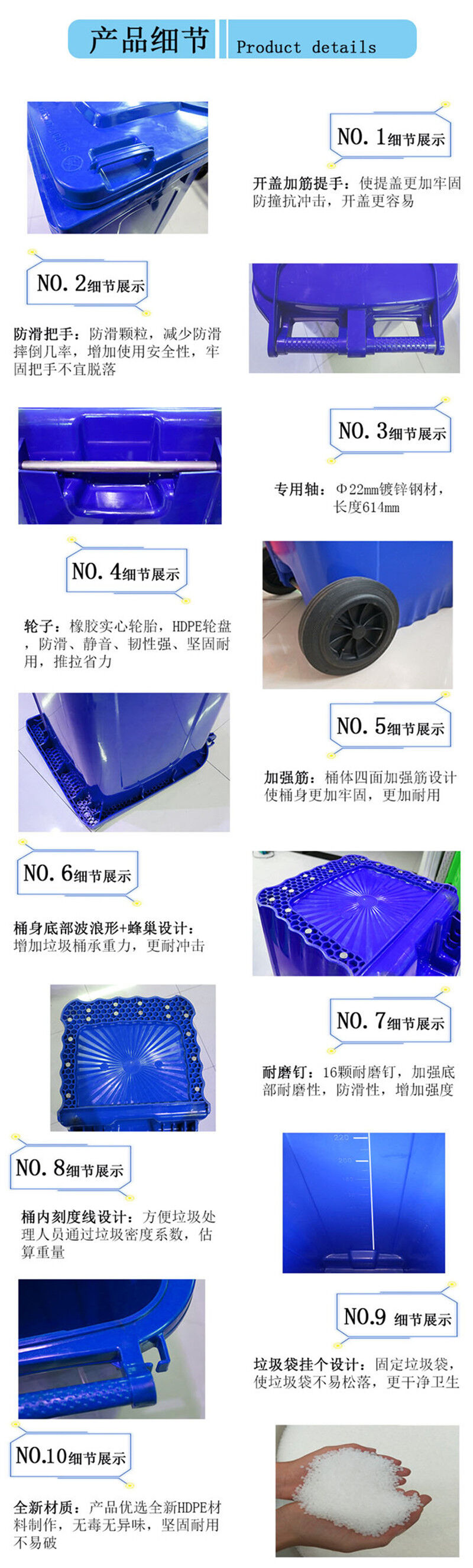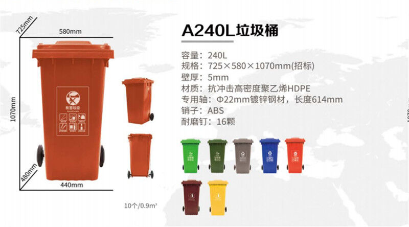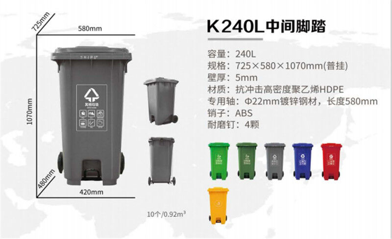 240L塑料垃圾桶/塑料環衛垃圾桶,桶蓋密合,可防止異味散發,雨水侵入,蚊蠅滋生,桶身可相互套疊,方便運輸,節省儲運空間與費用,桶內外表面光潔,便于倒空垃圾與清洗,垃圾桶設計符合 人體工程學,輕便耐用,移動靈活。產品賣點。240L塑料垃圾桶價格不浪費,讓城市更美觀少占地:生活垃圾中有些物質不易降解,使土地受到嚴重侵蝕。垃圾分類,去掉能回收的,不易降解的物質,減少垃圾數量達50%以上。少環境污染:廢棄的電池含有金屬。約資源鎘等有害的物質。