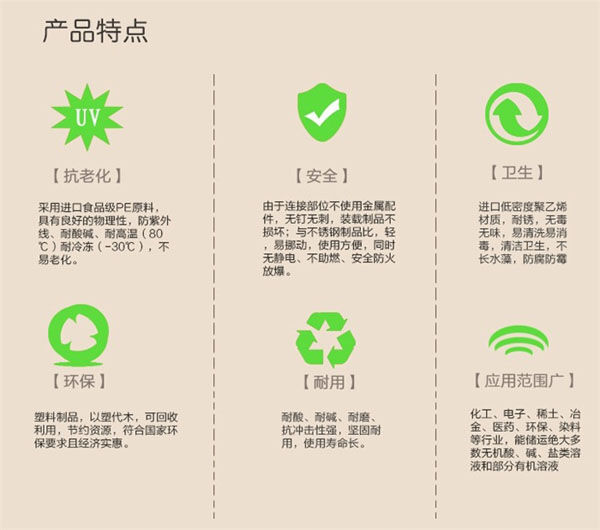 1、采用全新進(jìn)口聚乙烯PE料制作無毒、無味,質(zhì)輕堅(jiān)韌、安裝移動(dòng)簡(jiǎn)便,全部采用進(jìn)口塑料制成,不添加回料,質(zhì)量有保證。