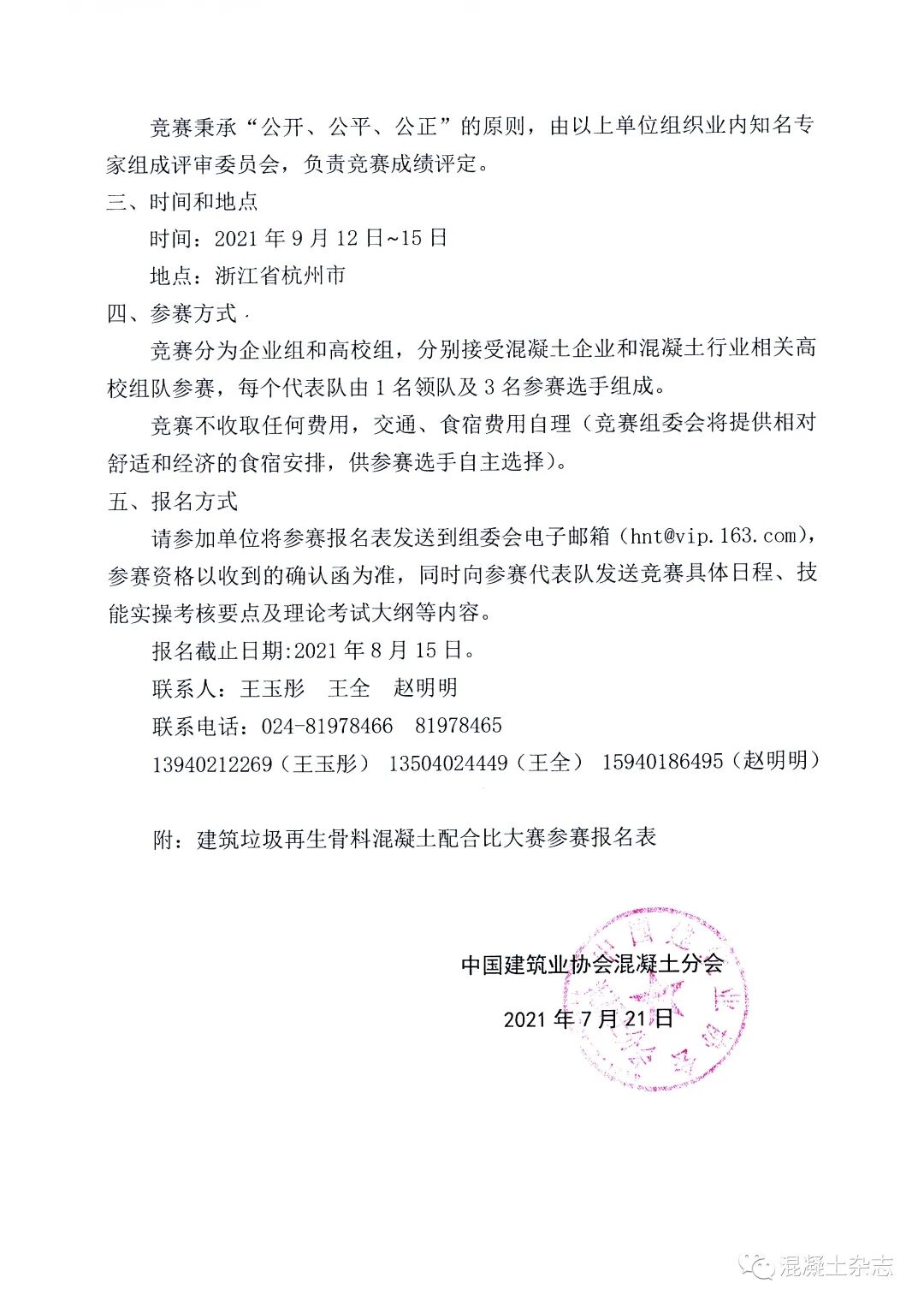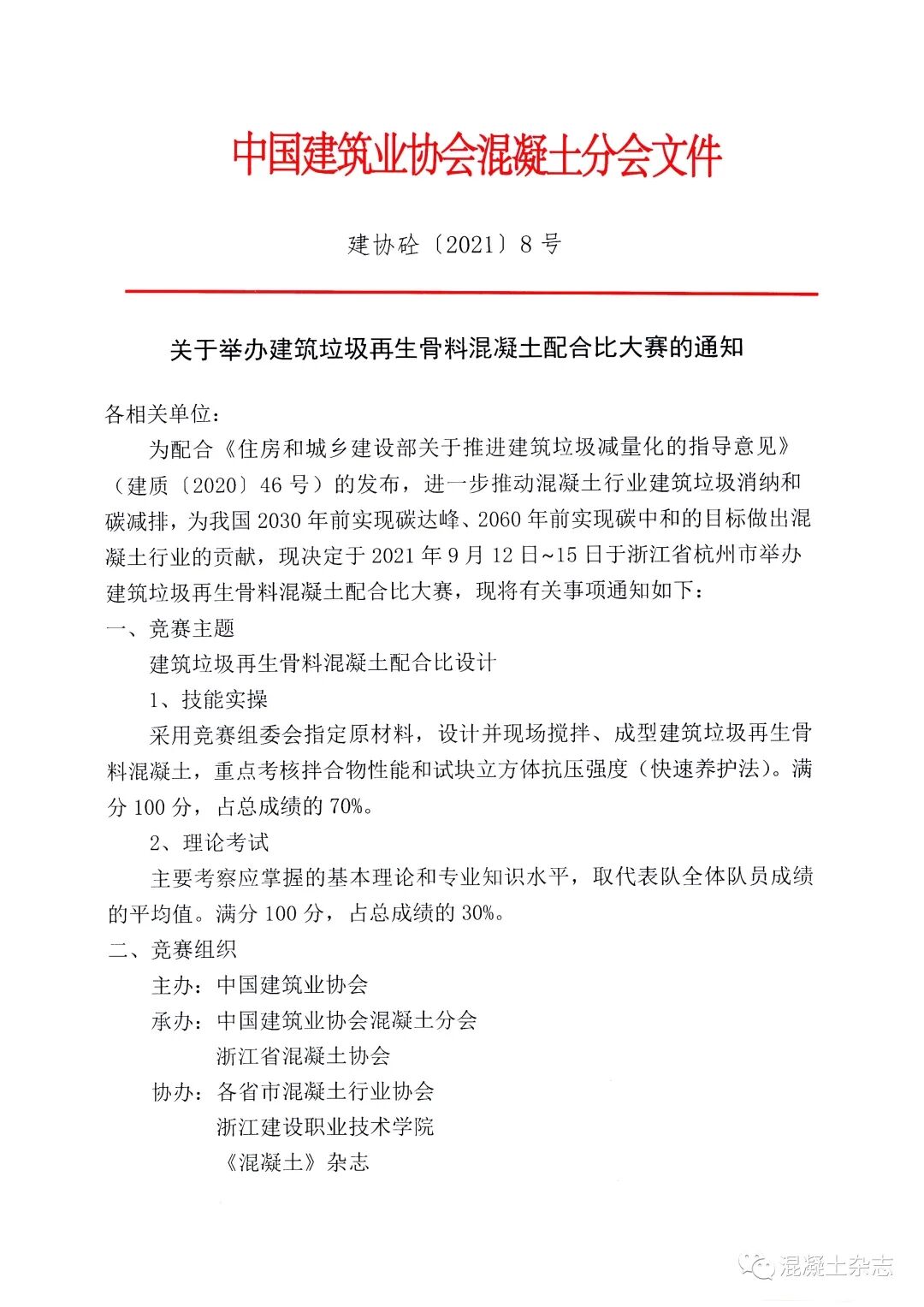 為配合《住房和城鄉建設部關于推進建筑垃圾減量化的指導意見》(建質〔2020〕46號)的發布,進一步推動混凝土行業建筑垃圾消納和碳減排,為我國2030年前實現碳達峰、2060年前實現碳中和的目標做出混凝土行業的貢獻,現決定于2021年9月12日~15日于浙江省杭州市舉辦建筑垃圾再生骨料混凝土配合比大賽。