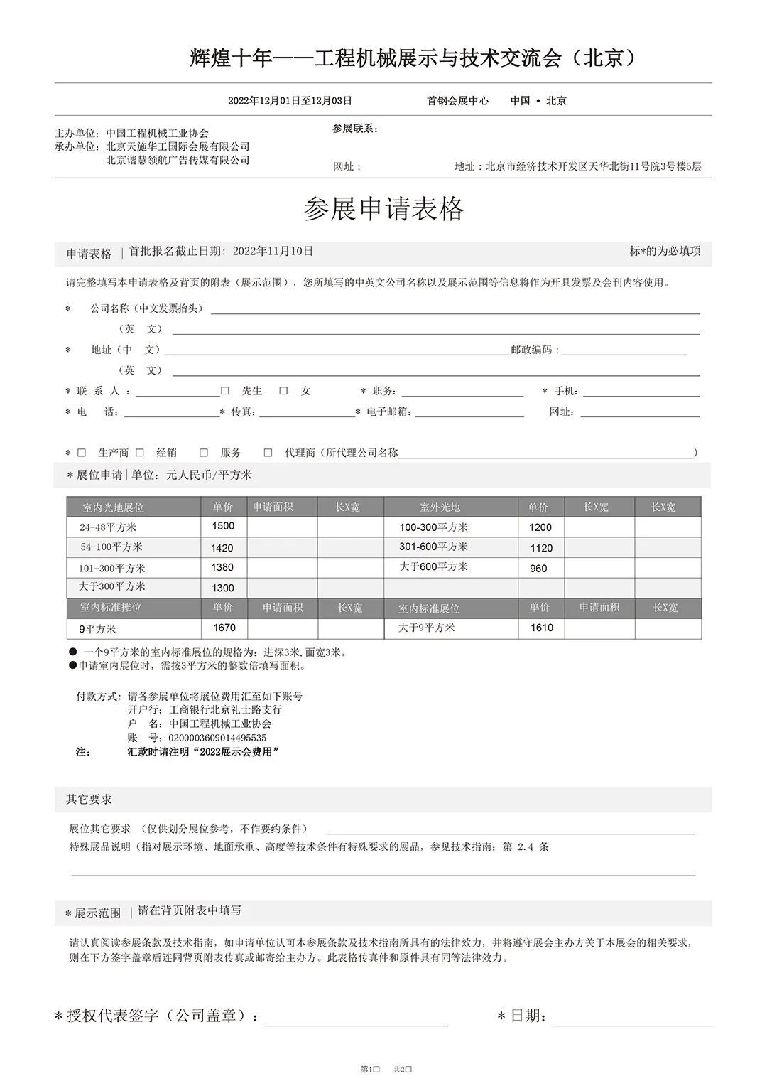 自協會發布舉辦“輝煌十年——工程機械展示與技術交流會(北京)”(以下簡稱“展示會”)通知后,得到了各參展單位的快速響應和積極支持,有的已經報名大面積參展,有的正在履行審批程序或來電表示參加展出,組委會深表衷心感謝!為及時傳遞展會信息,服務好廣大展商,辦好本次展示會,現向廣大展商正式發出邀請,并將有關展示會方案說明如下:一、為充分展示黨的十八大以來工程機械行業各領域取得的發展成就,協會研究決定召開本次展示會,邀請廣大協會會員和產業鏈上下游企業參展,共同分享企業發展成就和謀劃行業美好未來。二、展示會于2022年12月1日至3日在北京冬奧會滑雪大跳臺項目舉辦地——北京首鋼會展中心舉辦。屆時協會將邀請政府部門、相關用戶、媒體朋友和廣大觀眾到展示會現場參觀交流。12月3日(周六)實施社會公眾開放日,讓社會觀眾充分體驗工程機械發展魅力。三、北京首鋼會展中心適合舉辦室內高品質展示會,室外面積有限,而且適合承重較輕的產品展出。組委會初步規劃總展出面積2萬平米左右,希望各參展企業提供產業鏈上下游的先進技術產品和高端裝備進行展出,大型設備和示范工程應用等可通過模型、圖片、視頻等方式展示。展示會主要目的是系統總結和全面宣傳十年來行業企業發展成就,參展方式可靈活多樣。四、組委會設定報名截止日期為2022年11月10日,以便統籌組織好運輸、布展和活動安排,高效推進各項運營服務工作,確保展出效果。五、組委會將展館規劃為綜合類企業、專精特新企業、單項冠軍、高端重器、智能裝備、綠色產品、高端配套、先進產業鏈供應鏈等展區,供各參展單位選擇。六、展示會期間組委會將舉辦“中國工程機械行業高質量發展論壇”及其十多場系列會議、論壇和展示會選樹等活動。七、為便于展商報名和有序確定展位,本文隨附發布“展商報名表”、“展區規劃圖”、“展館示意圖”等,詳見附件。