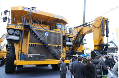 徐工在bauma2014上展出XDE240大型電傳動礦用自卸車,該車載重量230t,額定功率2500hp,發動機配置MTU16v4000,發電機采用GE GTA-41,牽引電機采用GE B25,輪邊減速比為31.8:1,采用交—直—交電傳動技術