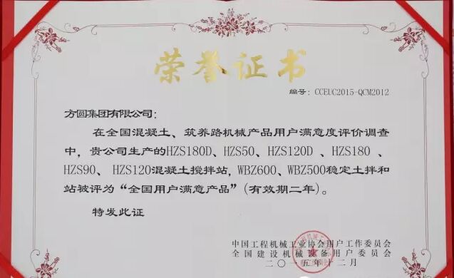 方圓集團憑借在售后服務領域的突出表現,榮獲“用戶滿意服務單位”的稱號,同時,方圓集團生產的HZS180D、HZS50、HZS120D、HZS180、HZS90、HZS120型混凝土攪拌站,WBZ600、WBZ500型穩定土拌和站被評為“全國用戶滿意產品”。