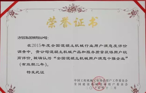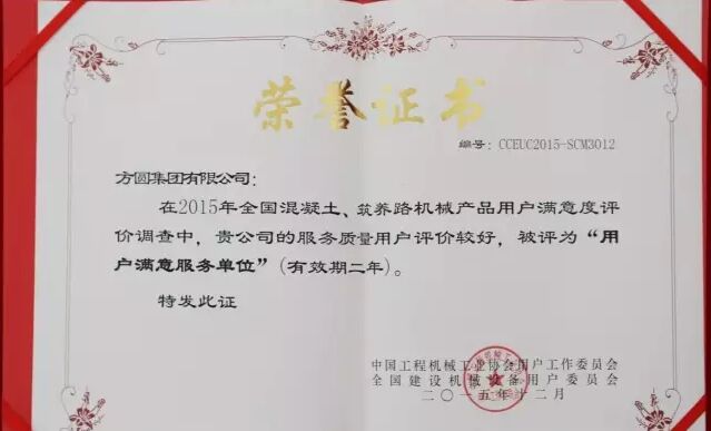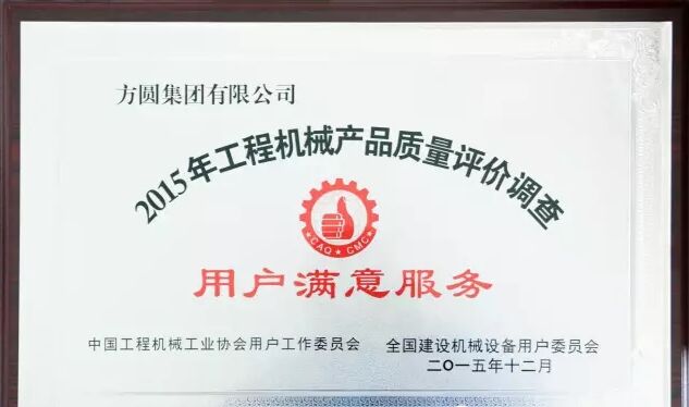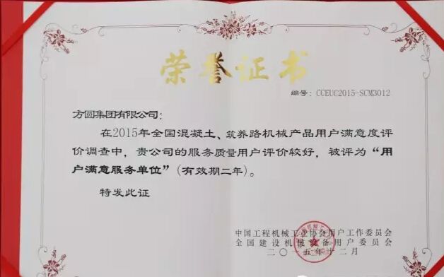 此外,因為方圓集團在2015年度全國混凝土機械行業用戶滿意度評價調查中,受到廣大用戶的一致好評,被授予“全國混凝土機械用戶滿意十強企業”稱號。在產品質量調查中,連續七次被評為“全國用戶滿意單位”。